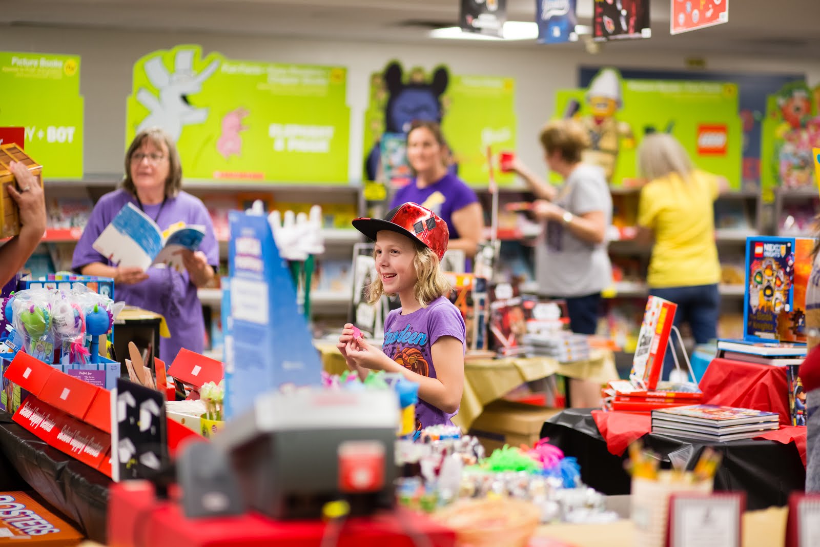Ramsie drawing the winners at the Bookaneer Book Fair teacher preview.