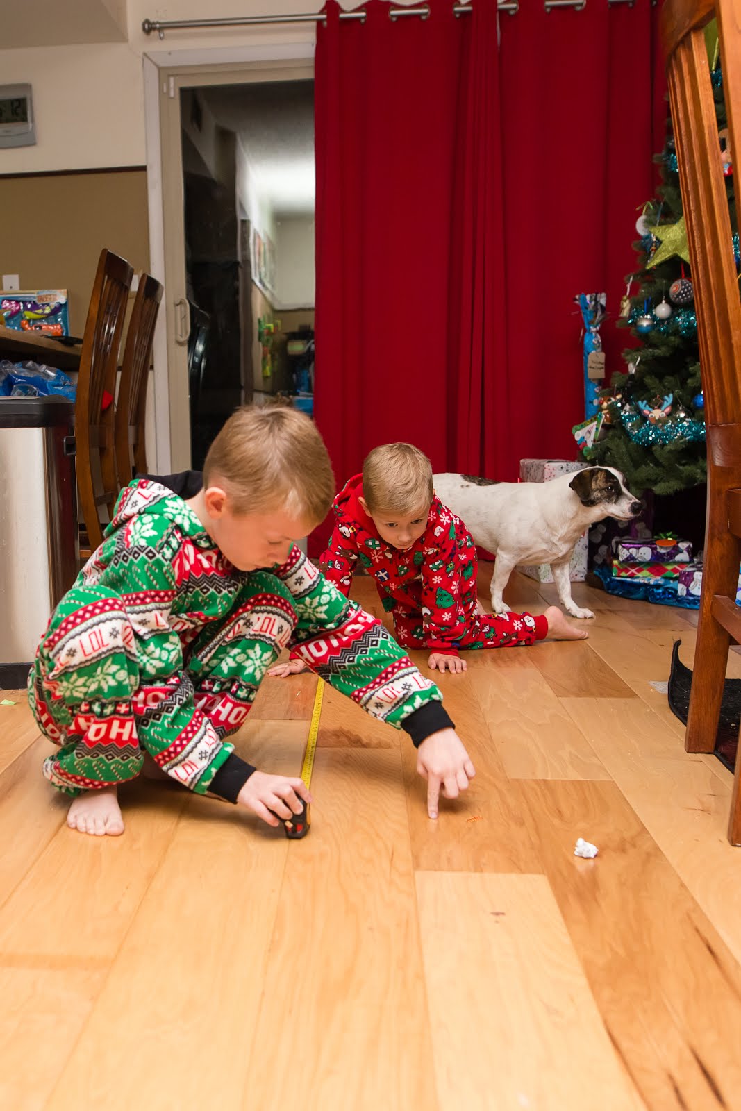 Logan measuring how far different items launched from his catapault for an After School Academy take home project while Connor looks on.