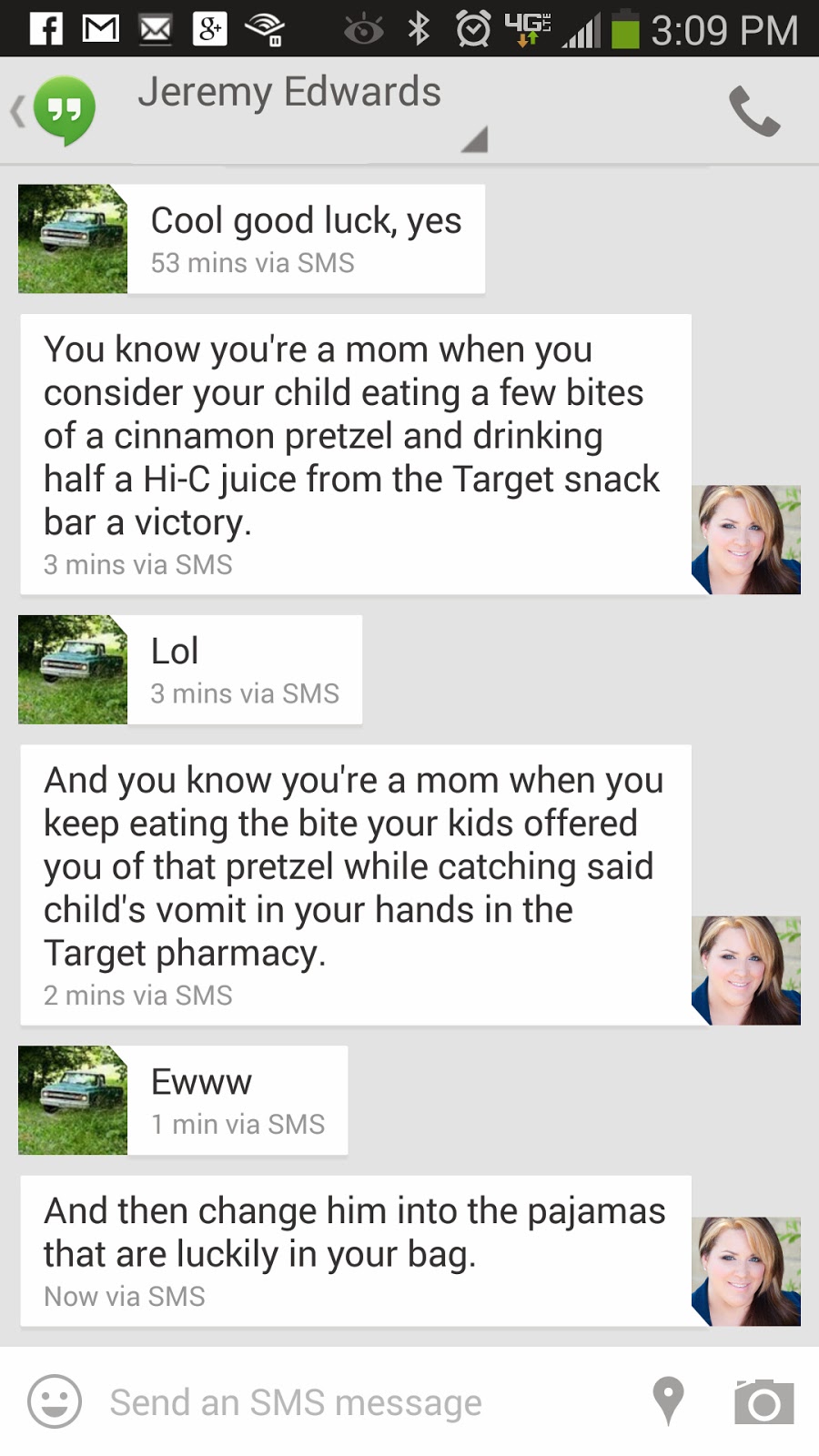 Connor hasn’t had much to eat or drink in the last 24 hours, or slept much for that matter. So when we went to Target to pick up his prescription I told him he could have anything he wanted. He chose a Hi-C juice box and a pretzel from the snack bar. He ate a bit of the pretzel and drank half the juice box when it came back up while we were waiting for the pharmacy to find another Target that had the medication on the shelf so they could send us there. My text with Jeremy pretty much sums it up: