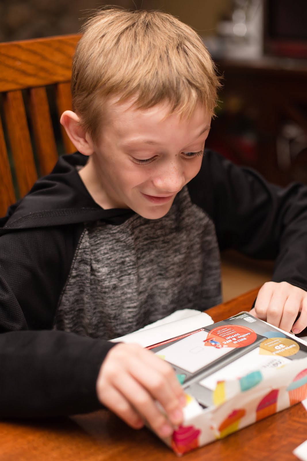 After laser tag, the boys and I went to Sweet Tomatoes at Logan’s choosing. We were too full for birthday cake after so we decided we’d save that for tomorrow when Jeremy is off work. Logan got to open his gifts from us when he got home and he got the gift he was really hoping to get for Christmas. Here’s the real photo for today of him opening his DS.