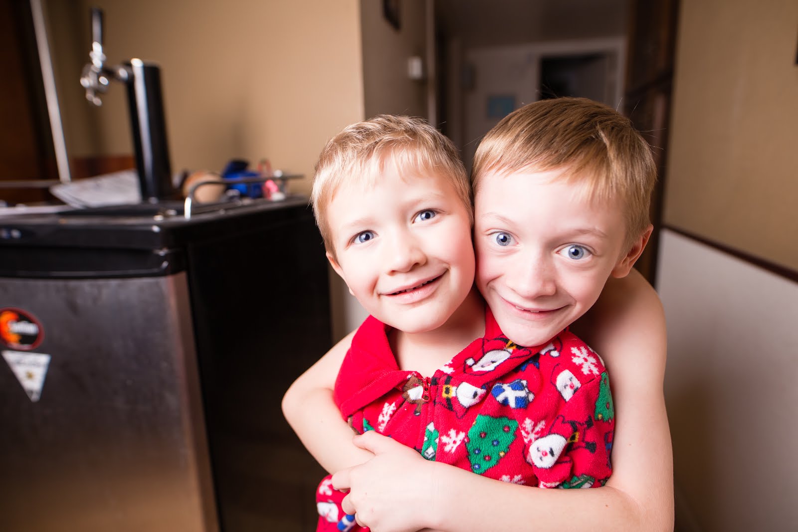 No one was too keen on a photo today, so I followed Connor down the hallway to get a photo of him after he got into his pajamas. He reluctantly agreed to turn around for a photo and then Logan jumped in and hugged him. Logan had a big smile on his face and Connor was a lot less grumpy from the surprise. Also, to my delight, it turned out that the photo wasn’t bad either and the kids are adorable in it too!