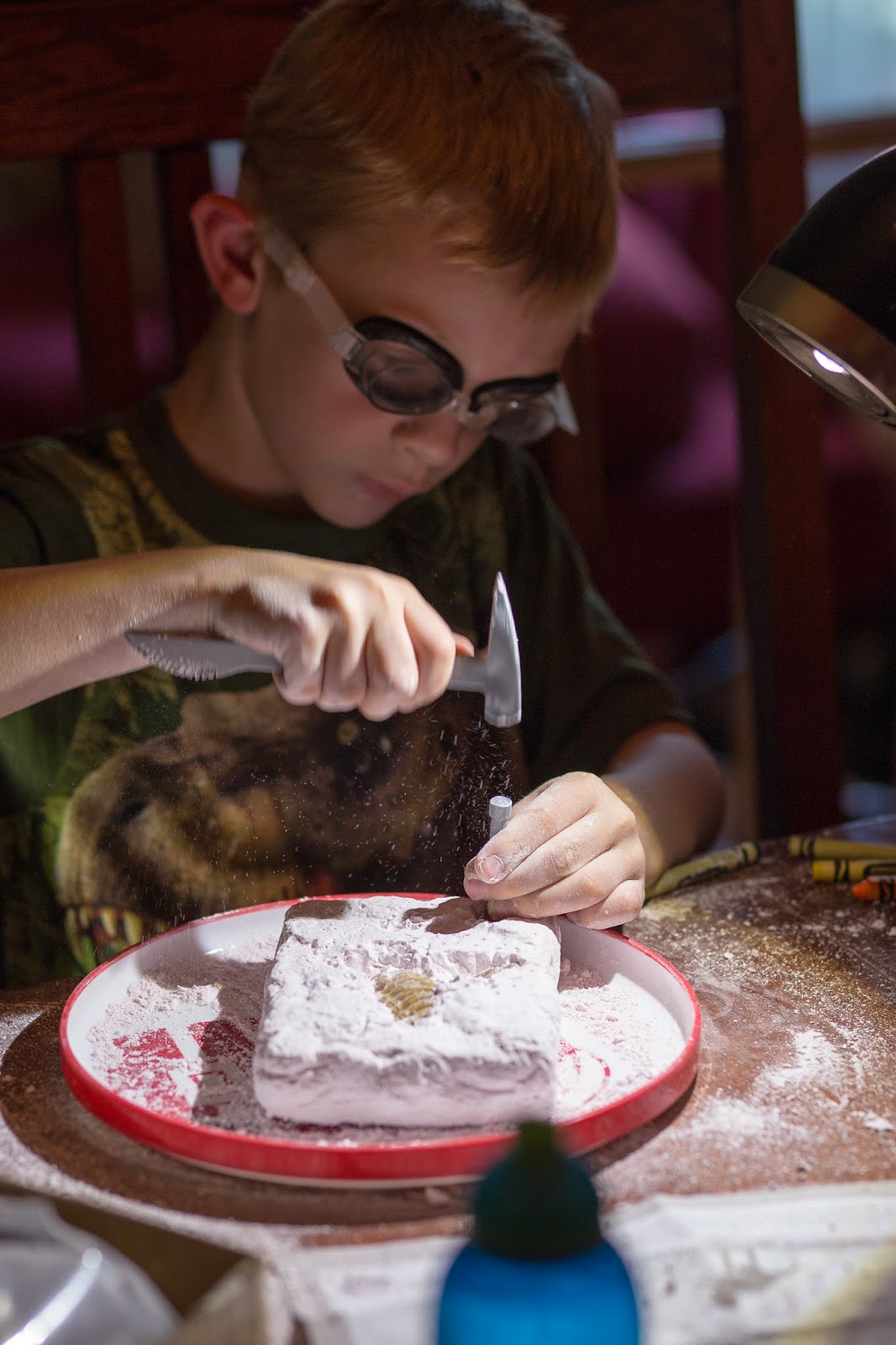 Logan bought a science kit that had plastic dinosaur bones he had to dig for. He got them out and then assembled a T-Rex.