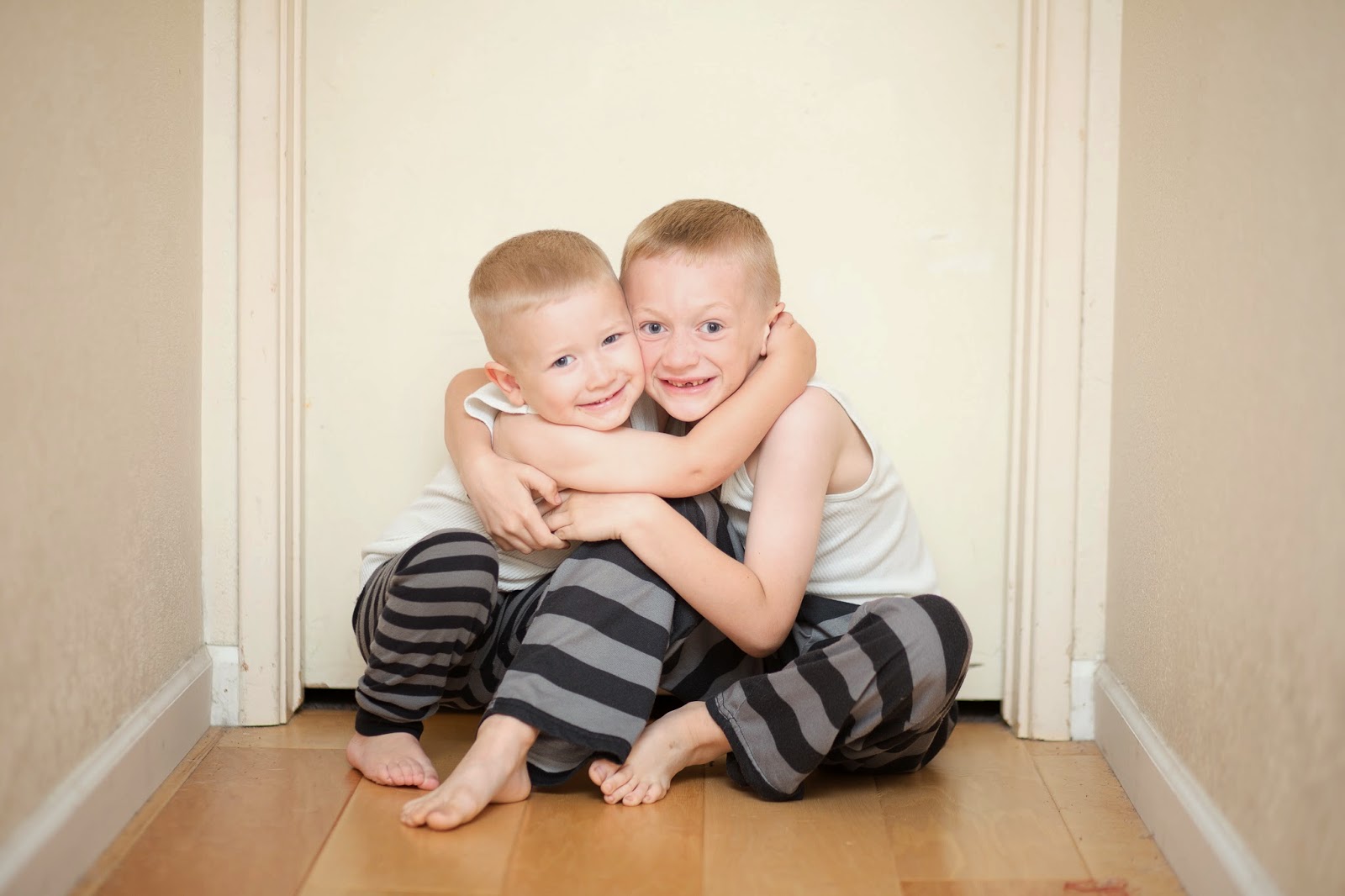 Happy to make themselves match for bedtime. Logan loaned Connor a white undershirt when they realized they both had grey and black stripey pajama pants.