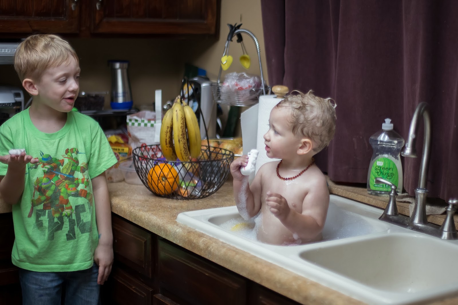 Connor has gone back to hating baths again, so I tried giving him his in the sink again. He still screamed the whole time, except when Logan gave him a snowman peep.