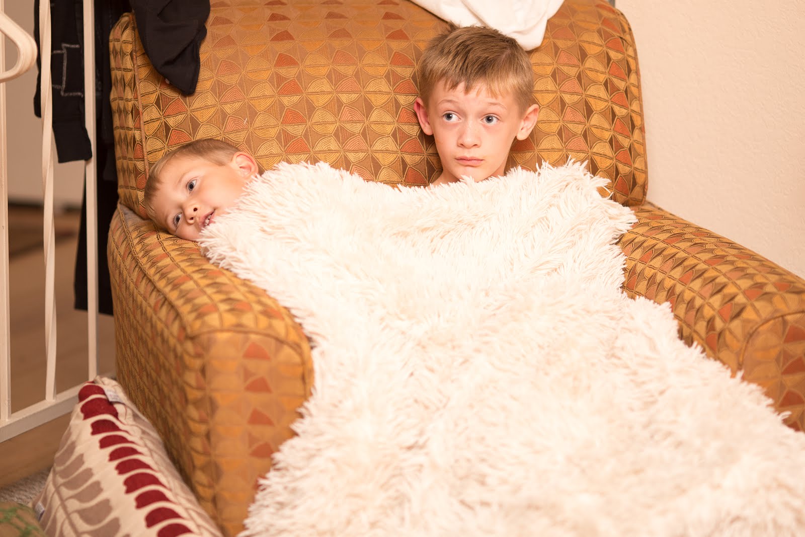 Snuggled up in the chair watching a movie.